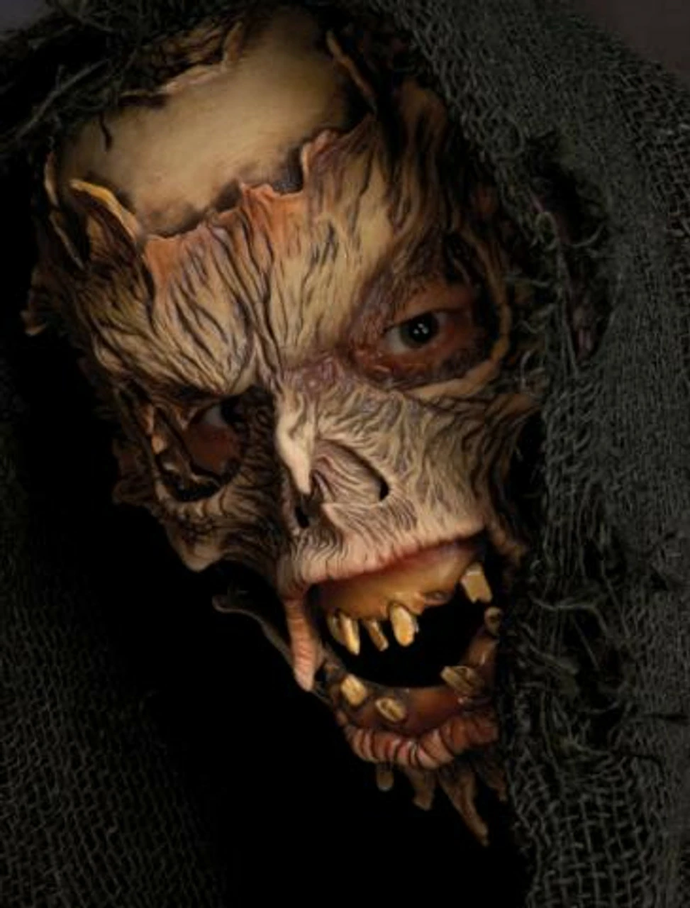 This 2 piece rotting zombie has good mouth movement. It is a 2 piece natural latex face assembled to a Polyester head sock. The integral rotting hood finishes the look. 1 lb. Hand poured, painted and assembled in the US.