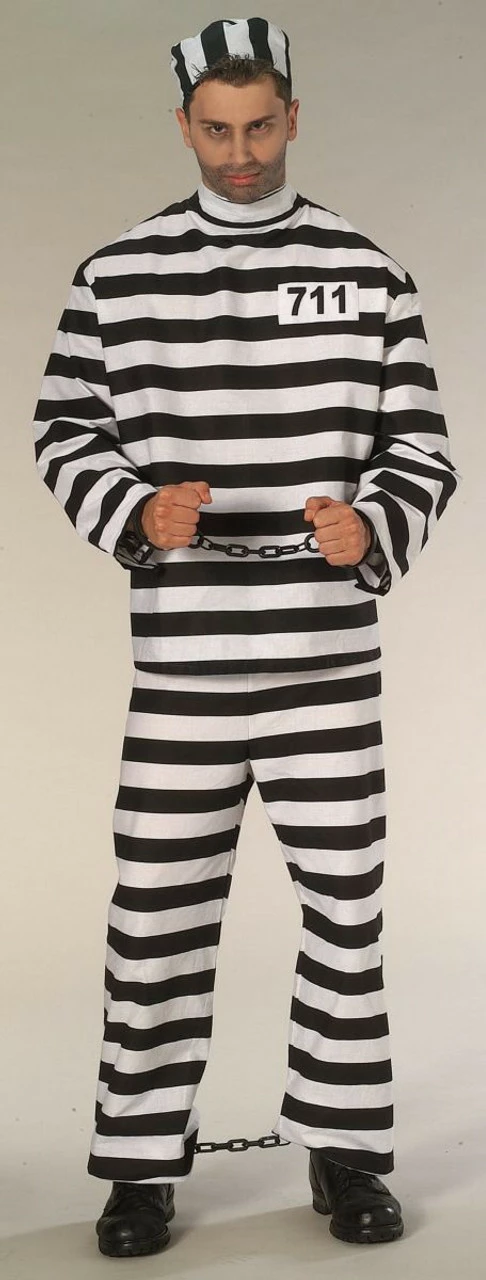 Convict costume is black and white striped polyester. It includes a long sleeve shirt with number patch, elastic waist pants, and a matching striped hat. Handcuffs not included.