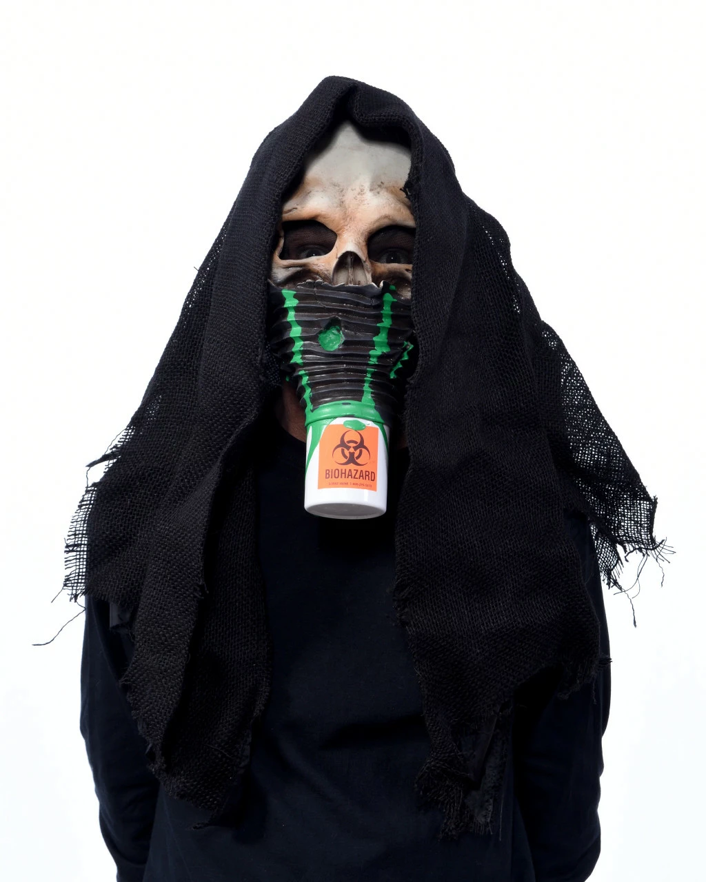 Aliens, terrorist or the Nukes of Hazard? The world will end and so will you. The sole survivor haunts the Earth cloaked in a fiendish rotting hood, feeding on toxic ooze. The wearer eyes are hidden with a black sheer material that you can see through.